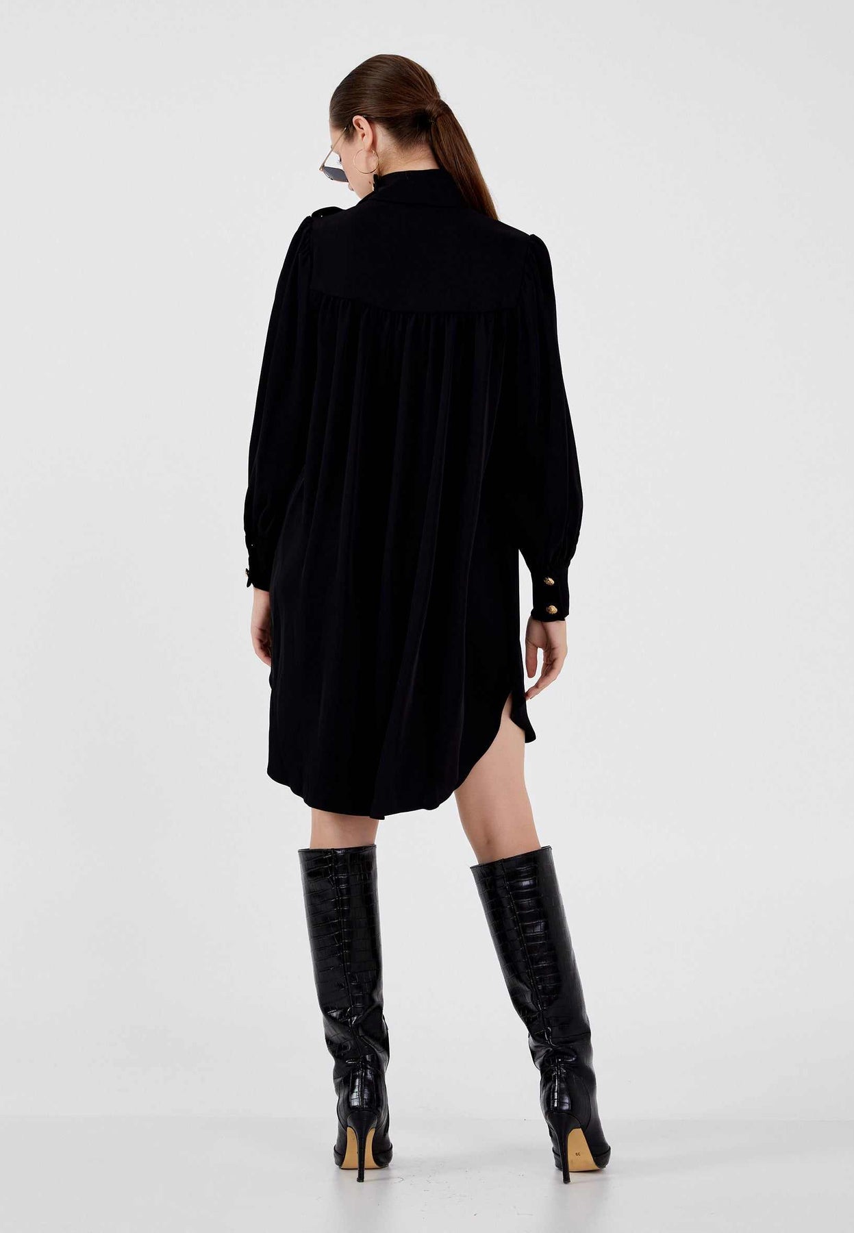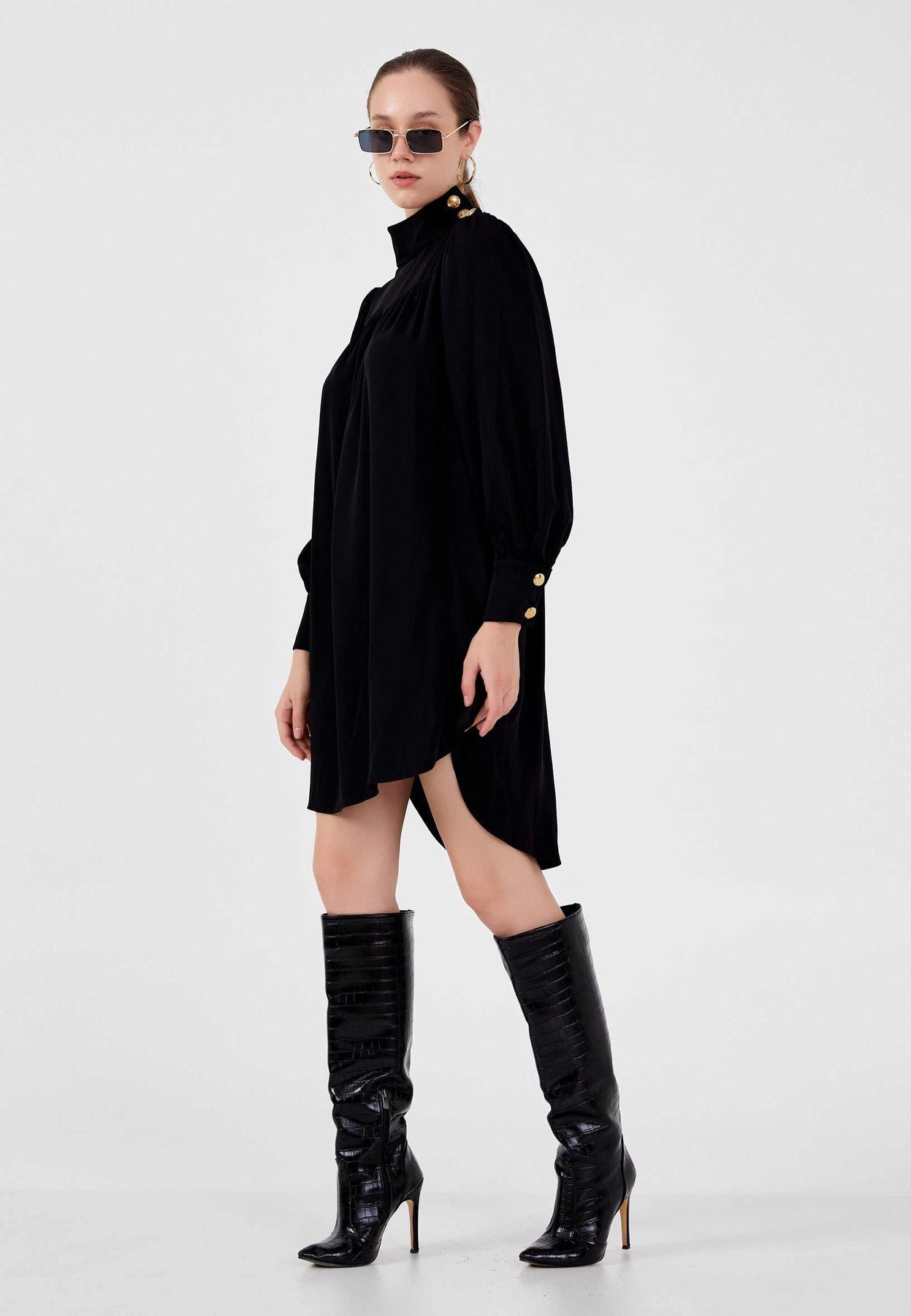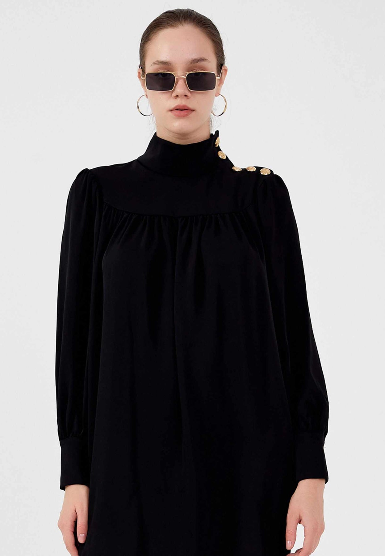 • Details: High neck, gold button accents on shoulders and cuffs, long sleeves