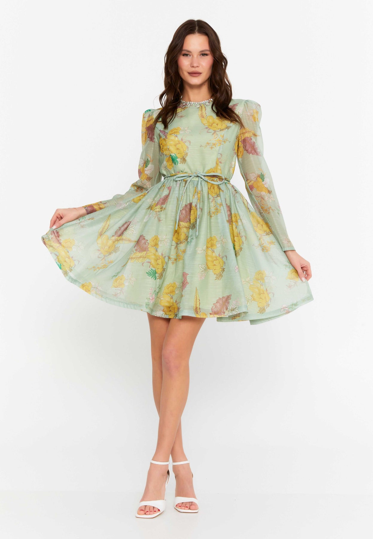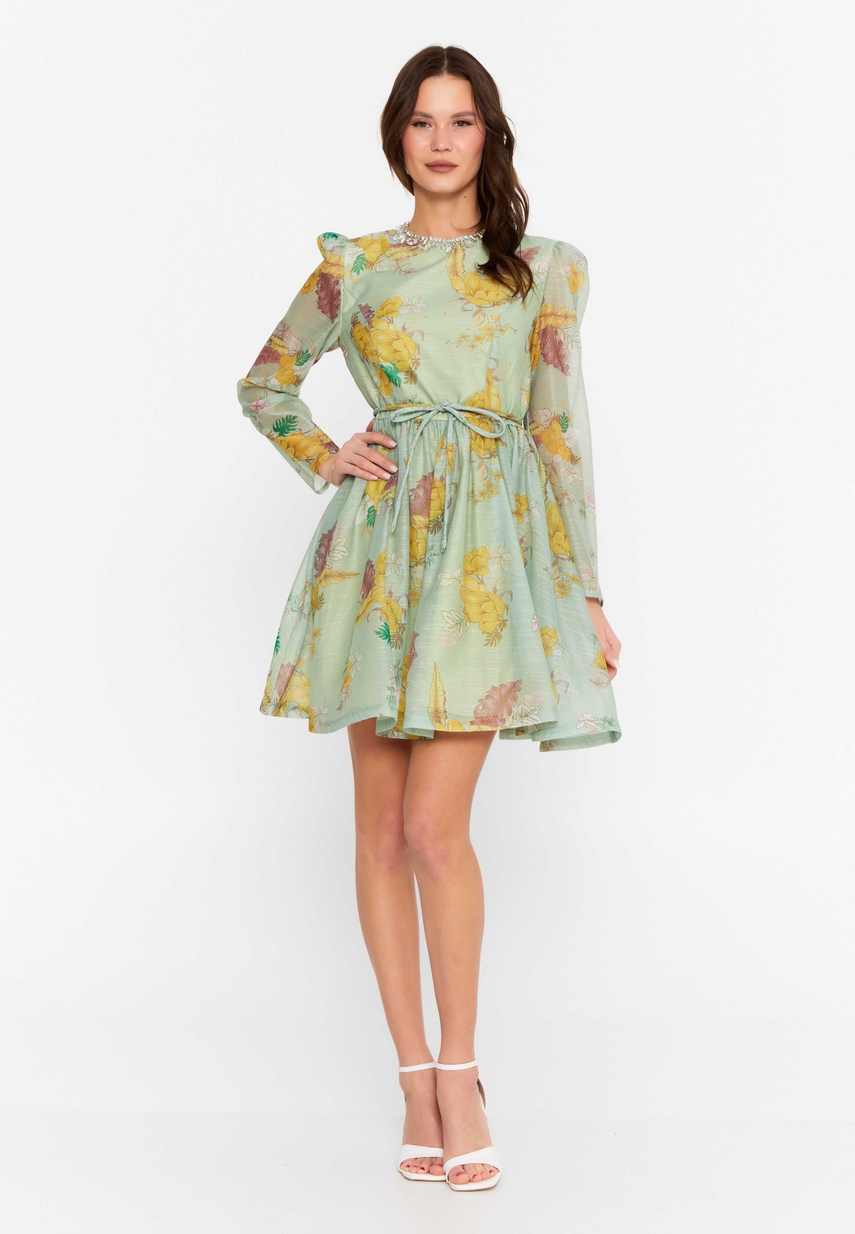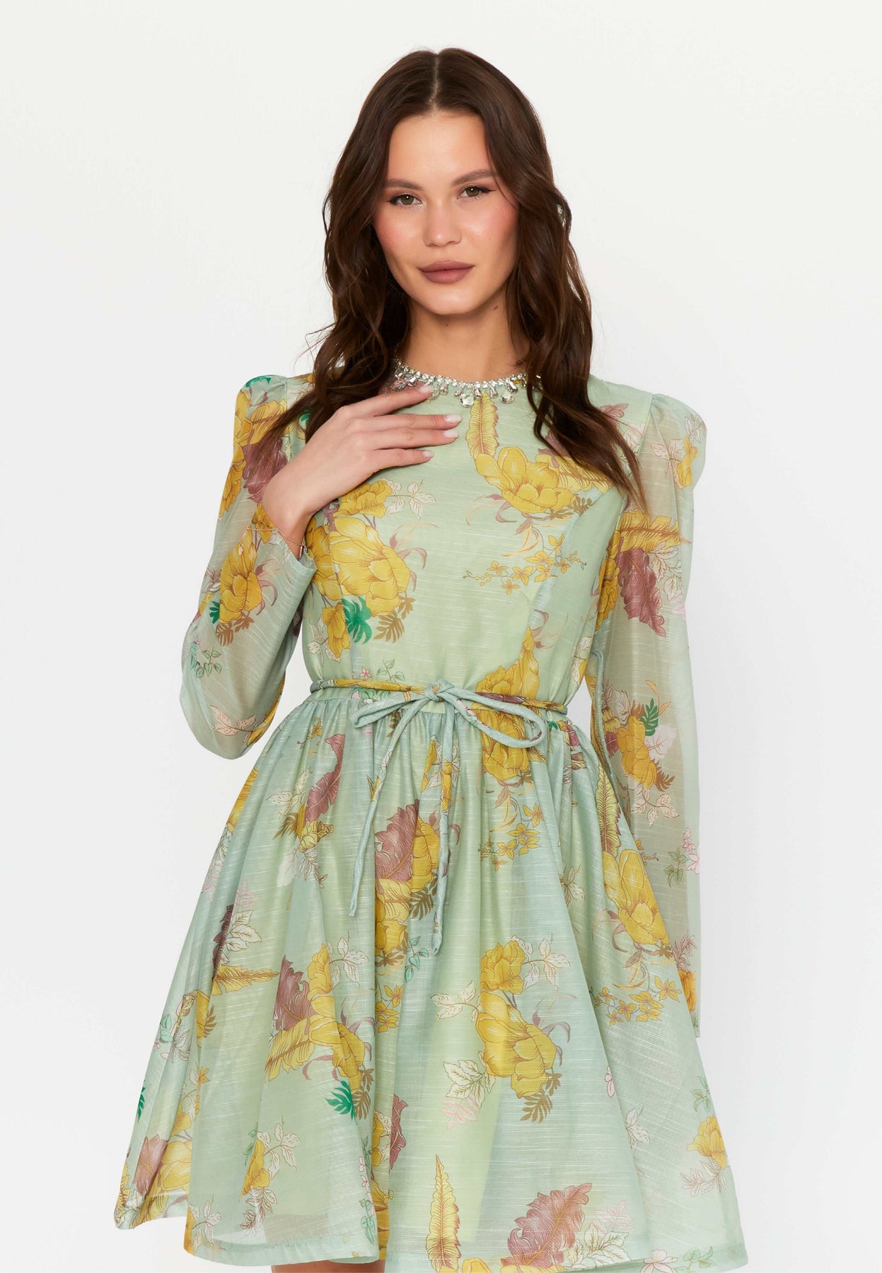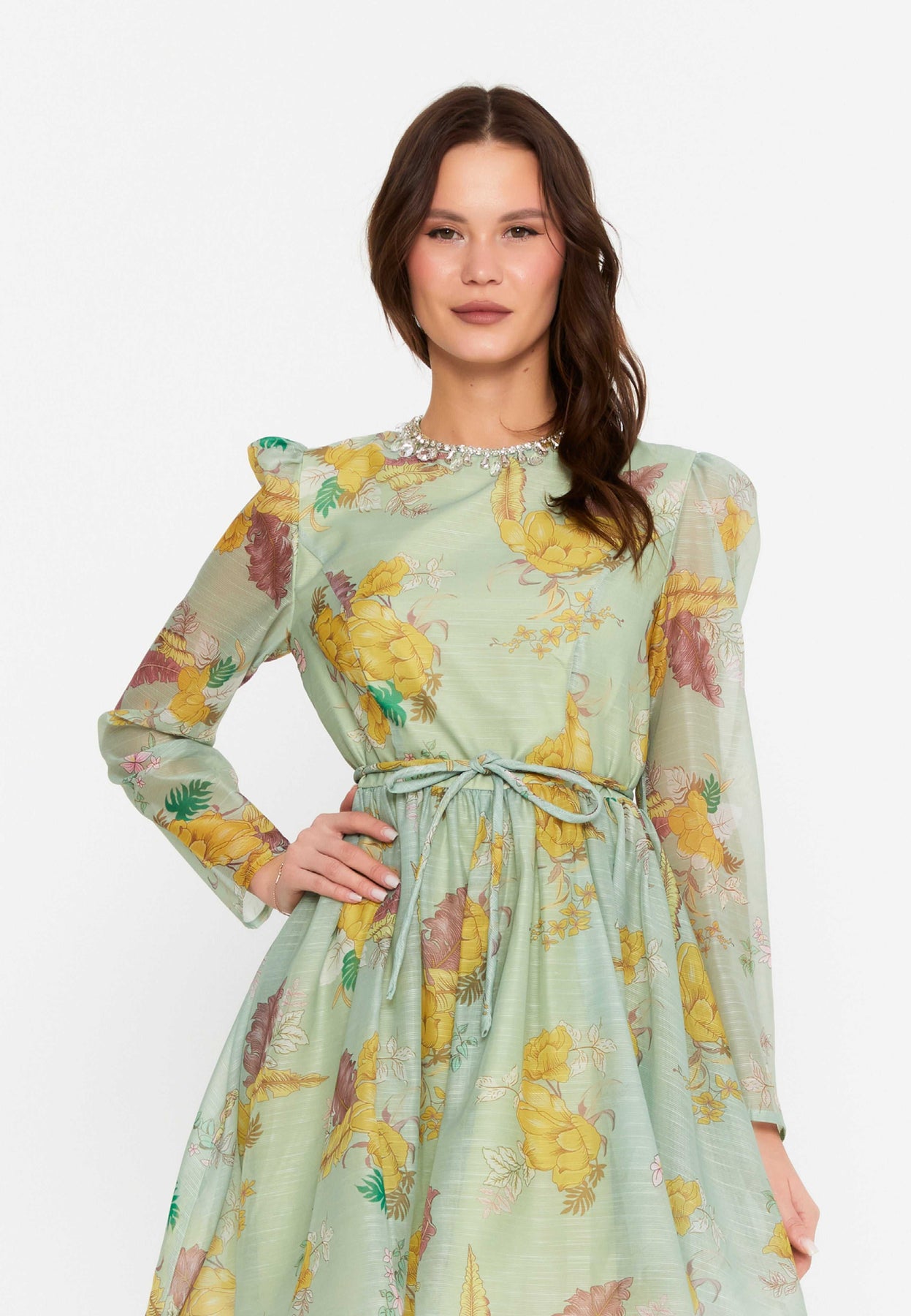 • Soft sage chiffon with vintage floral detailing