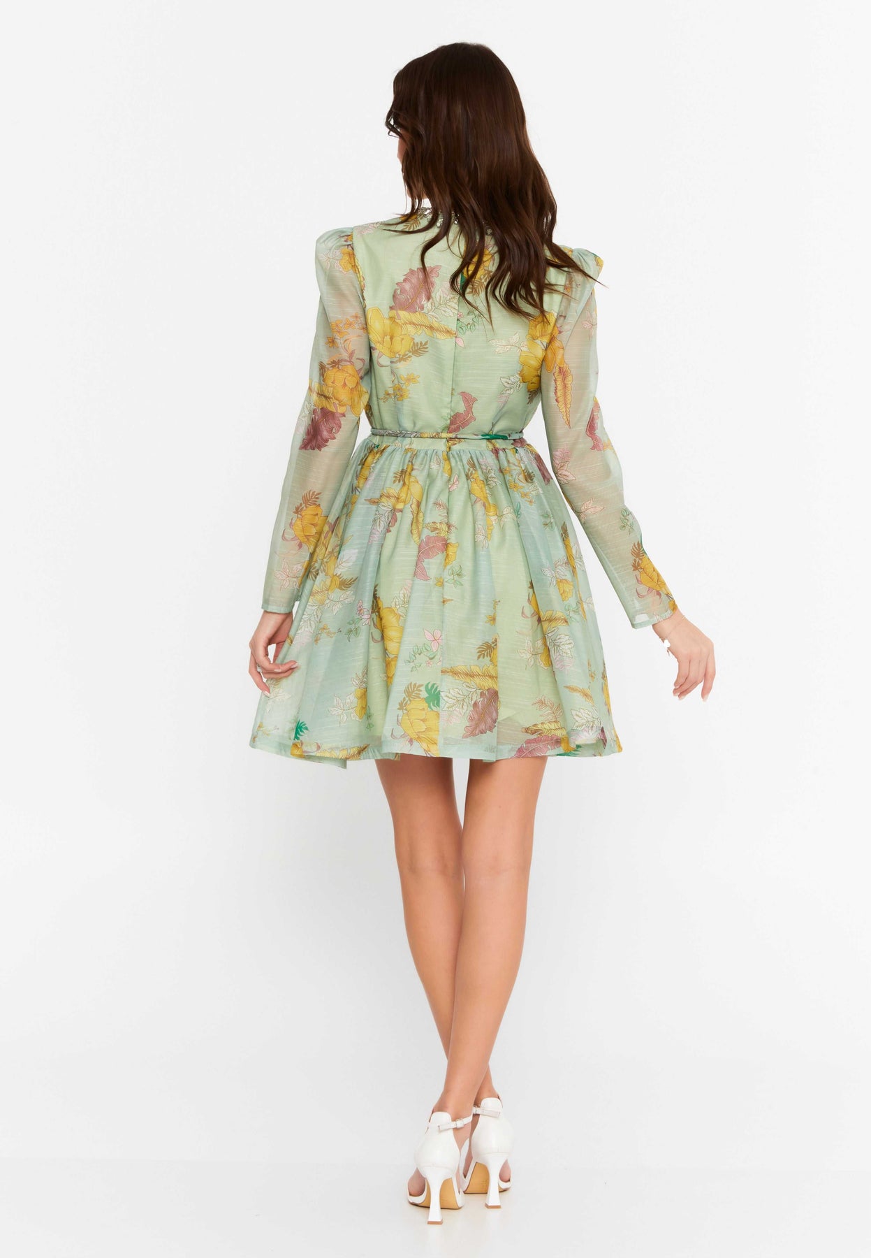 • Long sheer sleeves and puffed shoulder accents