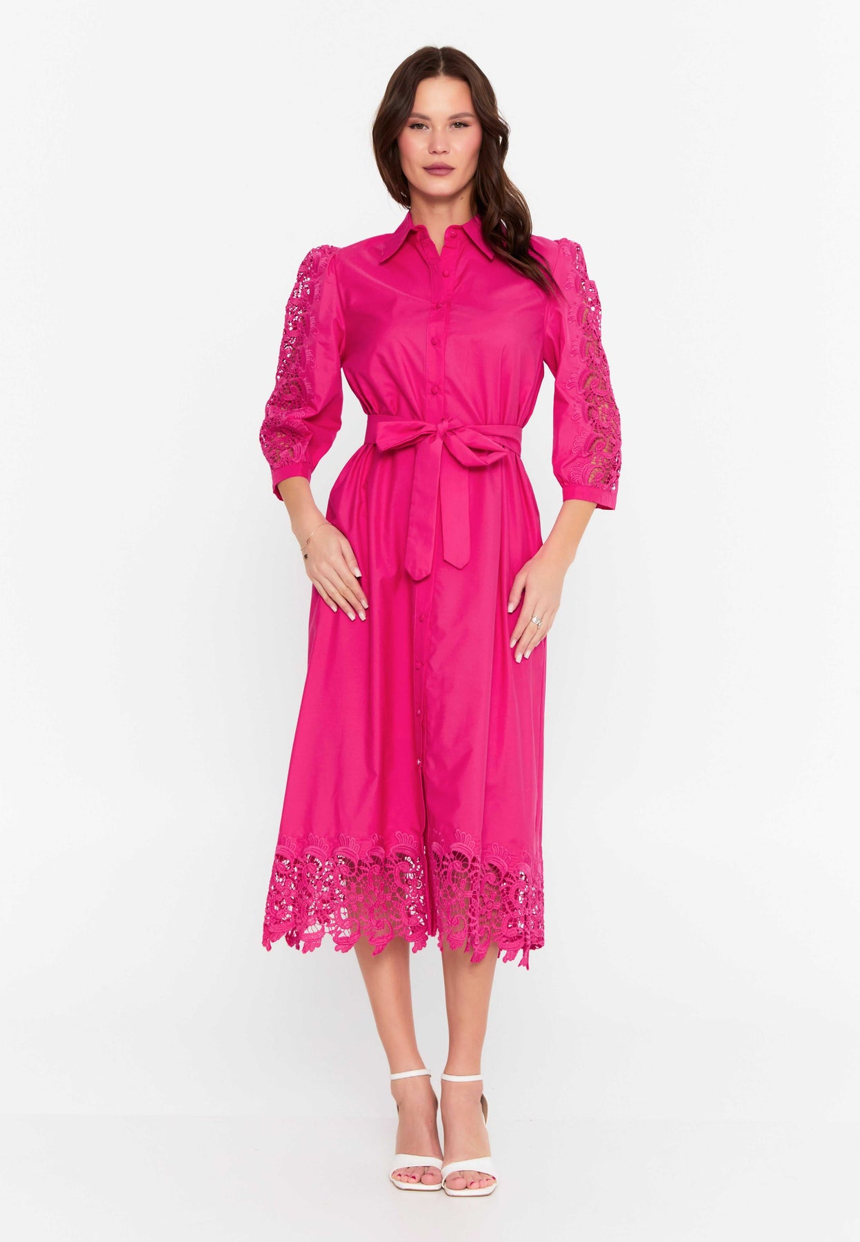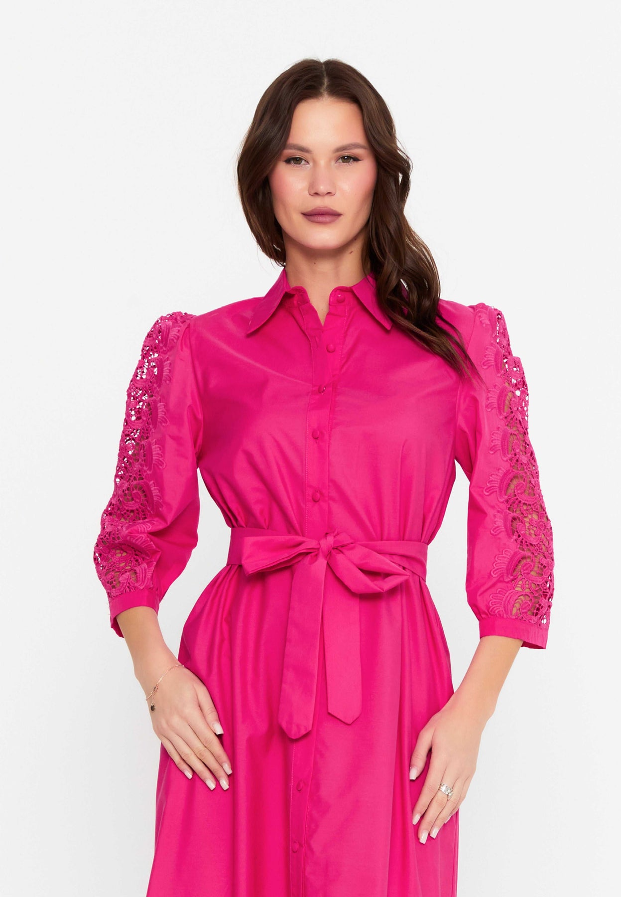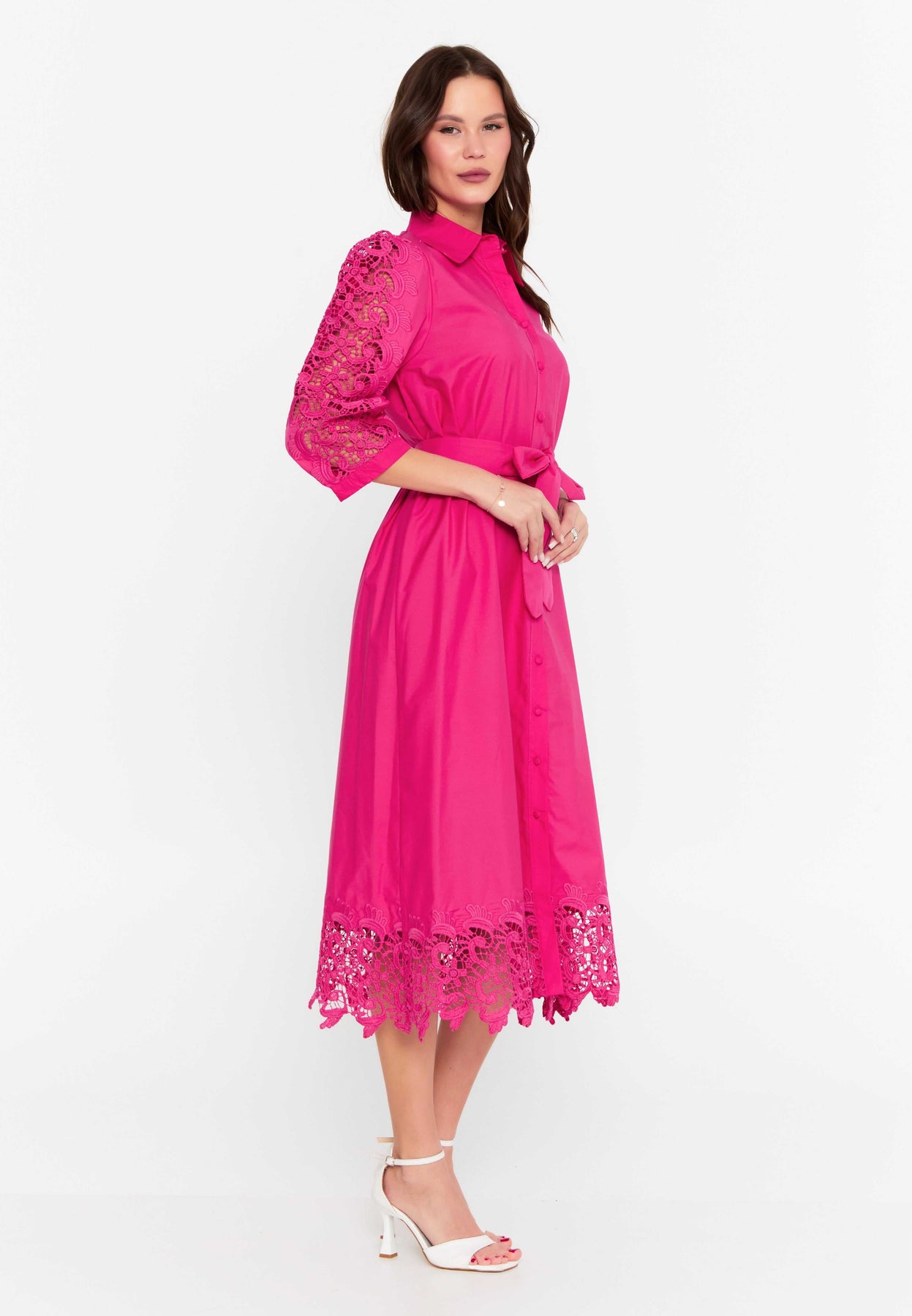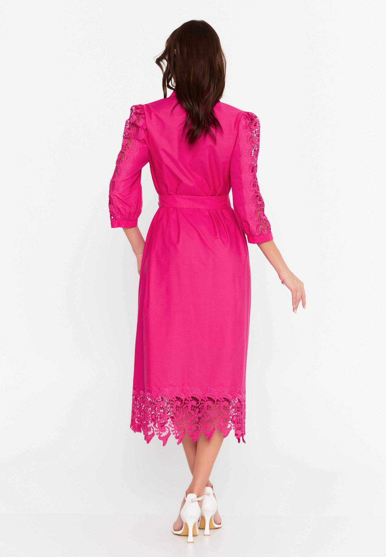 Vibrant fuchsia hue with detailed lace embroidery