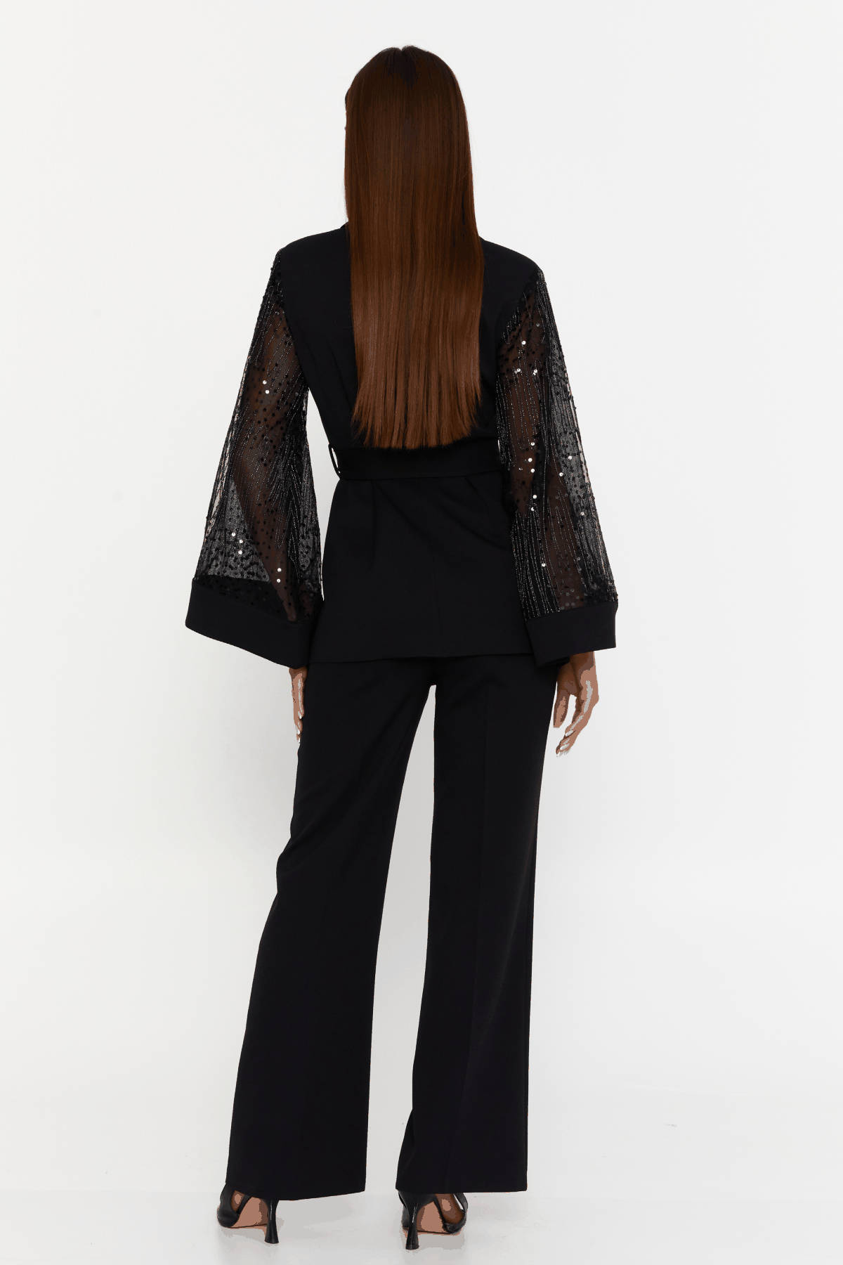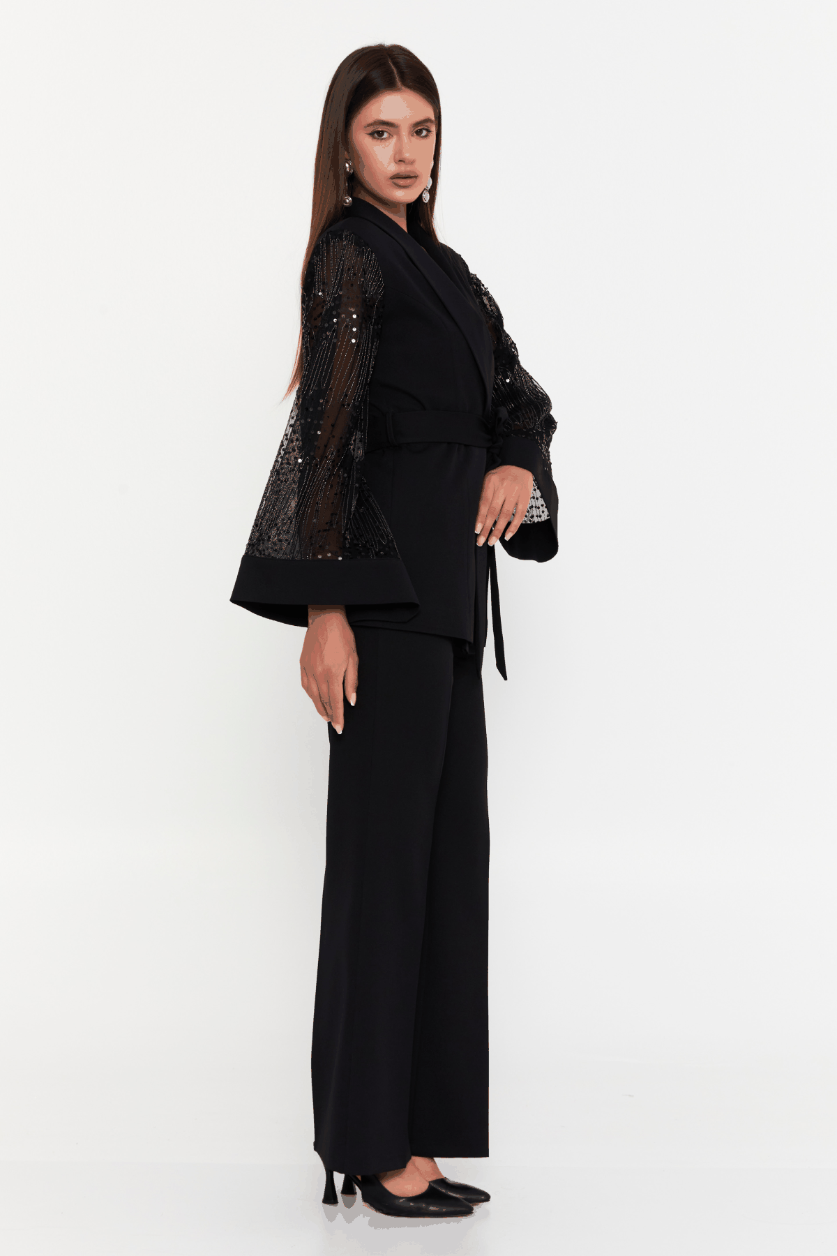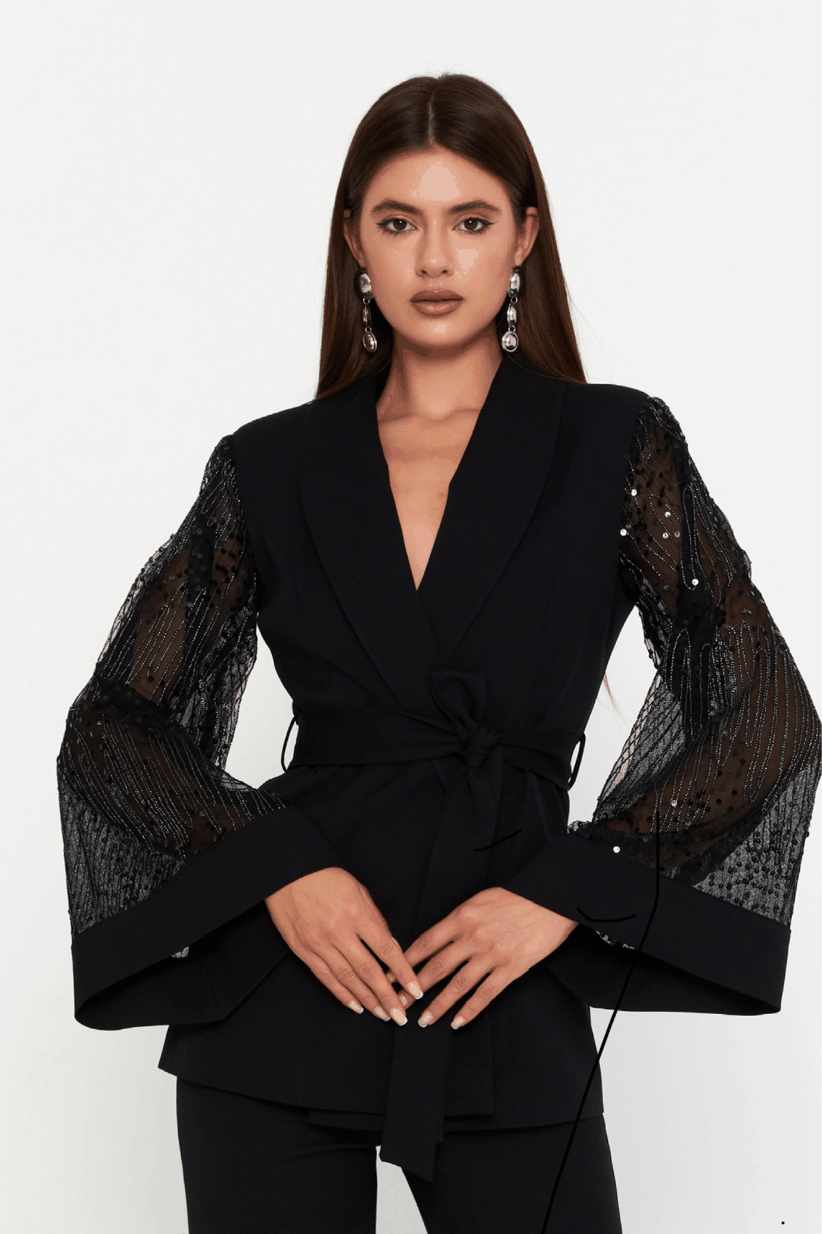 The blazer features a deep V lapel and a cinched waist tie, sculpting the silhouette with elegance. The sheer statement sleeves are adorned with subtle embellishments, adding dimension, texture, and evening glamour. Paired with wide-leg tailored trousers, the look is effortlessly refined and endlessly powerful.